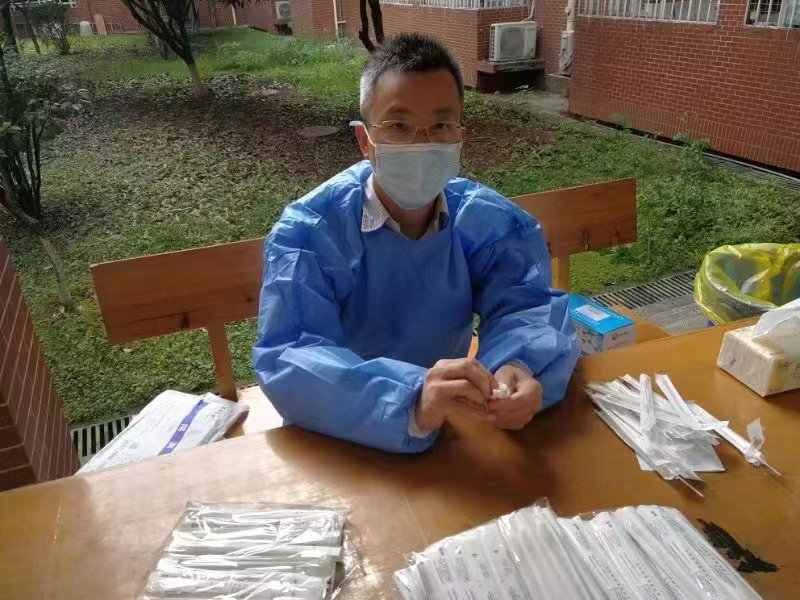 5月17日早上,三位同志在云塘校区体育馆集合后,按照学校防疫部门统一安排,分别被分配至行健轩1栋、3栋协助医护人员进行核酸检测。