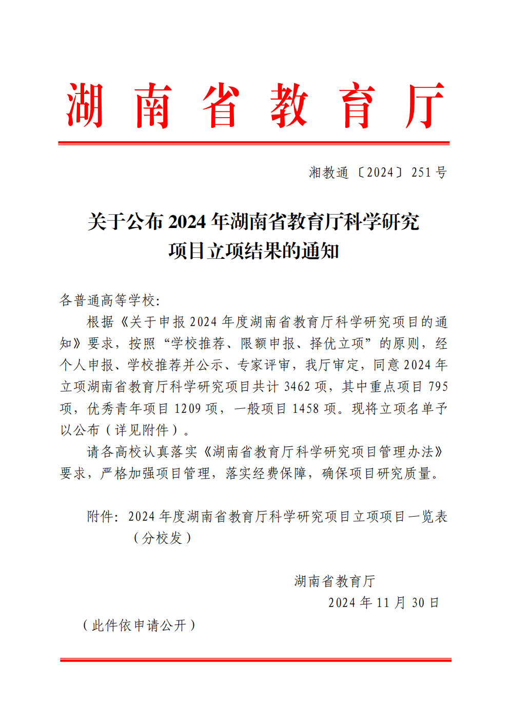 11月30日,湖南省教育厅公示了2024年湖南省教育厅科学研究项目立项名单,我院王寰副教授项目入选重点研究项目立项公示名单;黄雪博士、盛喜博士项目入选优秀青年项目立项公示名单;李慧君博士项目入选一般项目立项公示名单。