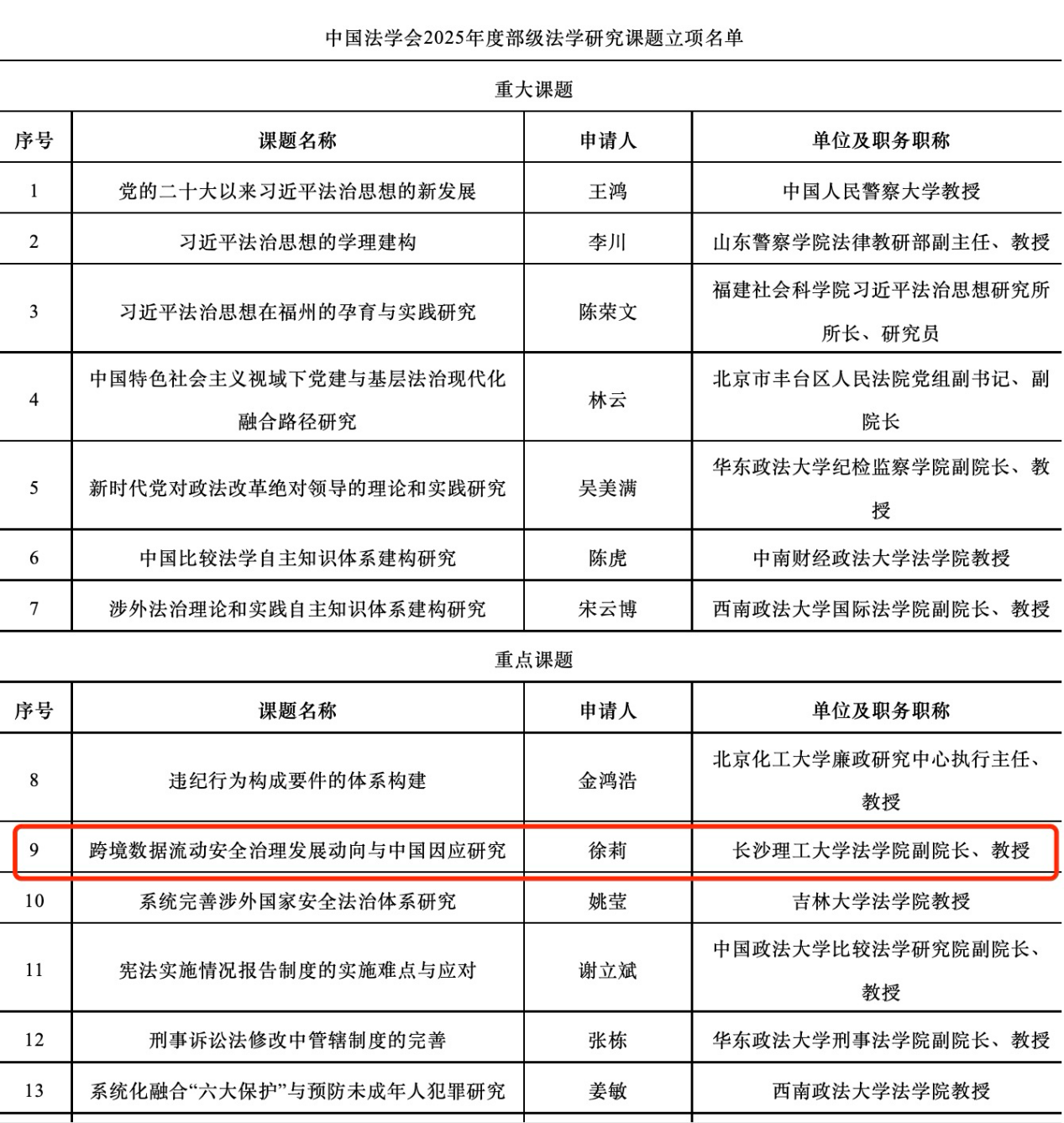 7月18日,中国法学会发布2025年度部级法学研究课题立项名单,我院副院长徐莉教授申报的"跨境数据流动安全治理发展动向与中国因应研究"获准重点课题立项。