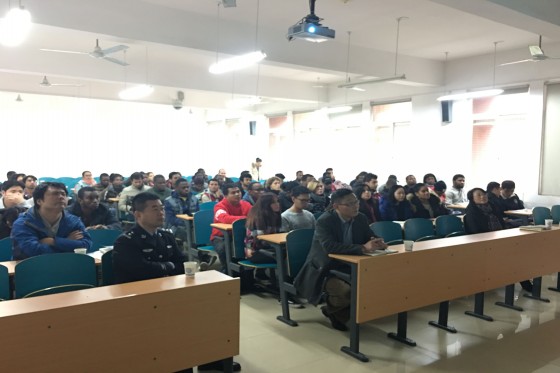 陈军教导员用流利的英文向同学们宣讲了《中华人民共和国出境入境管理法》,并以最近几年长沙市发生的涉外案件为实例,生动地展示了该法在长沙市的执行情况,使留学生们认识到外国人在华日常生活学习同样是在法律的监督下进行的。根据《中华人民共和国出入境管理法》和《中华人民共和国外国人出境入境管理条例》等相关法律法规中关于留学生来华密切相关的条款,陈军教导员进一步就签证、延签、居留许可及来华人员注意事项和安全问题做了详尽说明,要求留学生严格遵守我国的法律法规与学校的各项规章制度,顺利完成学业。