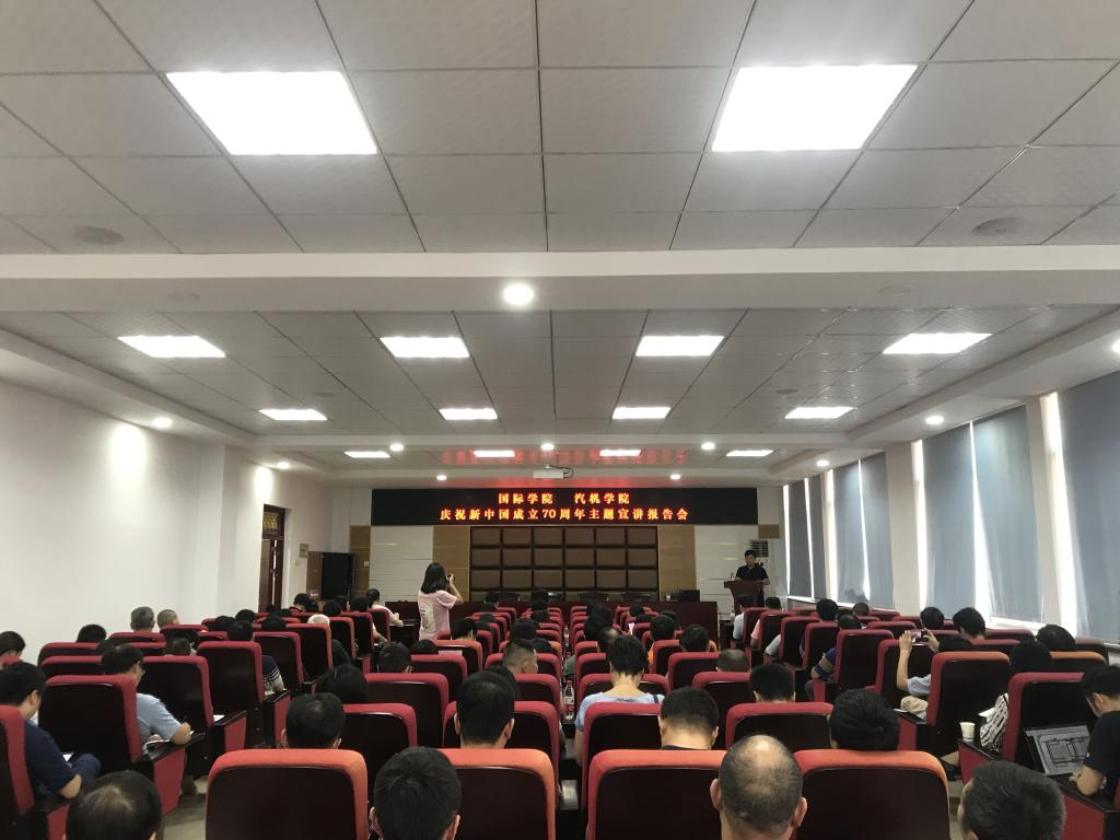 9月24日下午两点,国际学院、汽机学院庆祝新中国成立70周年主题宣讲报告会在工一B417举行。国际学院部分师生、汽机学院全体教职工和部分学生党员代表参加。学校党委委员兼国际学院党总支书记付嫦娥教授担任主讲,汽机学院党委书记邱国良担任主持人。