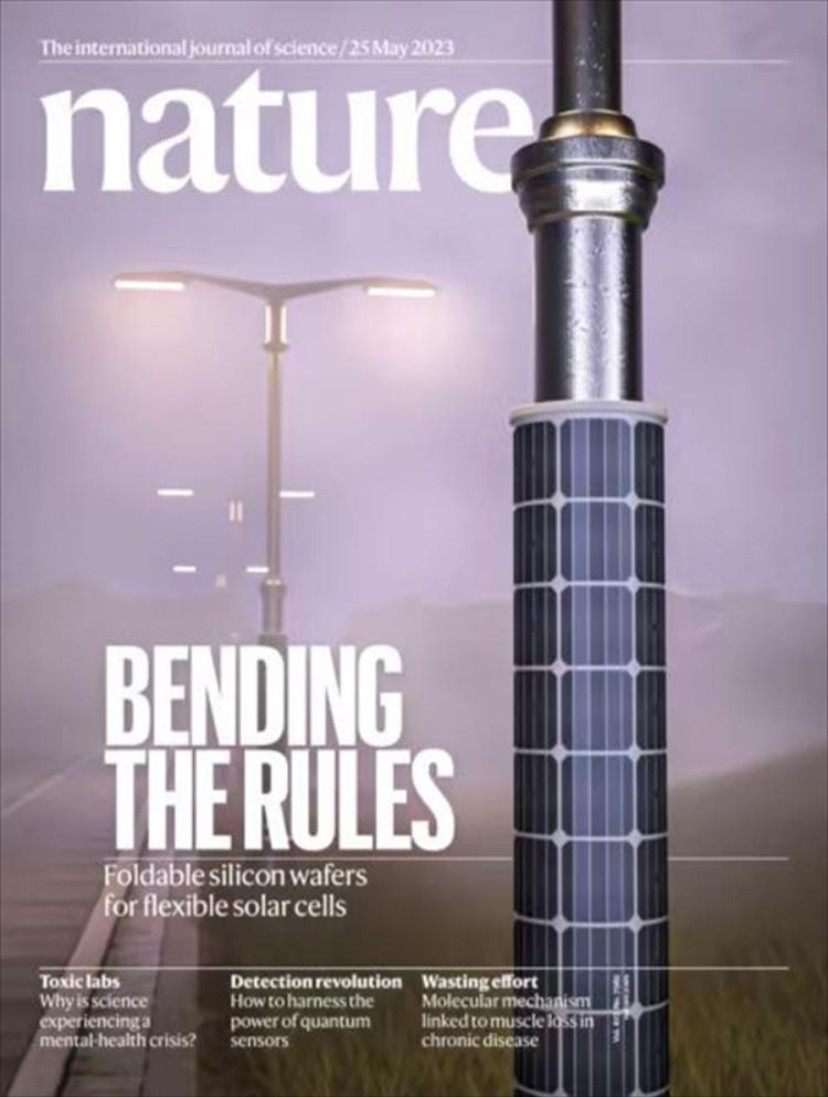 5月24日,国际顶级学术杂志《自然》主刊以封面文章形式刊发由我校“湖湘学者”特聘教授刘小春科研团队和国内外多家科研机构团队合作完成的突破性研究成果。论文题目为《 Flexible solar cells based on foldable silicon wafers with blunted edges》。为第三顺位署名单位,材料科学与工程学院刘小春博士和刘玉敬博士分别是论文的共同通讯作者和共同第一作者。文中,围绕晶硅太阳能电池制备中的关键科学问题,刘小春团队采用先进的双球差校正透射电子显微镜(以下简称TEM)表征技术,揭示了基片从本征“脆性”向轻质“柔性”转变的微观机理,为研发更轻质、更高效率、更低成本,可突破传统应用场景的柔性晶硅太阳能电池奠定了理论基础。