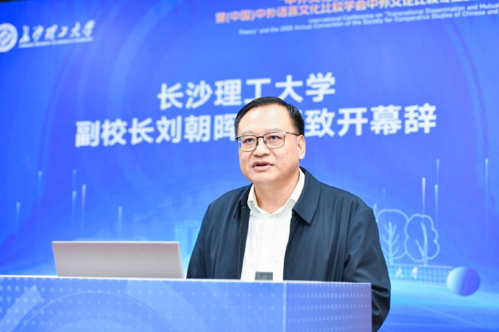 副校长刘朝晖教授在开幕式致辞,对大会的召开致以热烈祝贺,向全球与会专家学者表达诚挚欢迎,并衷心感谢各界长期以来对学校及外国语学院建设发展的关心支持。他指出,中外语言文化比较学会深耕三十余载,为繁荣国家文化事业、促进中外文明交流互鉴作出了重要贡献。其中,中外文论比较专业委员会搭建的跨域交流平台成果丰硕、广受赞誉。本次会议既能体现本领域研究的理论高度,又敏锐把握了时代脉搏。作为一所特色鲜明的多科性大学,外国语言文学学科是学校高质量发展的重要组成部分。外国语学院承办此次会议既是学习交流的契机,更是服务文化传播所应该担负的责任。他特别以毛泽东《沁园春・长沙》的豪迈意境呼应此次“百侣来游”的学人相聚,期许共拓中外文论研究新境界。