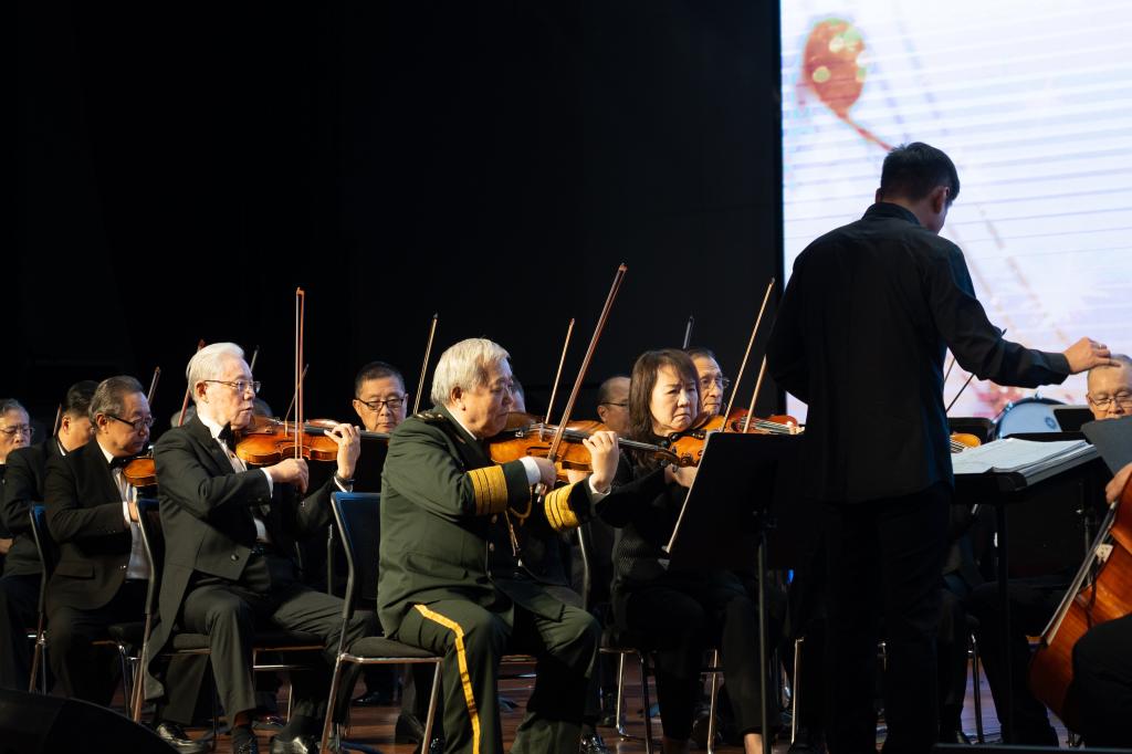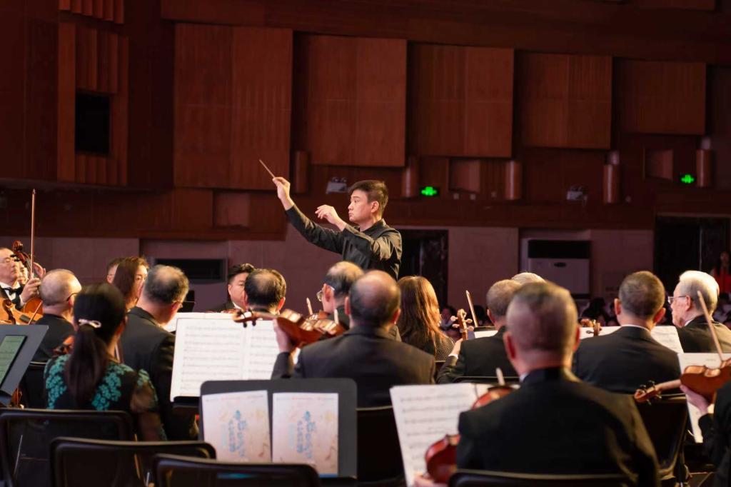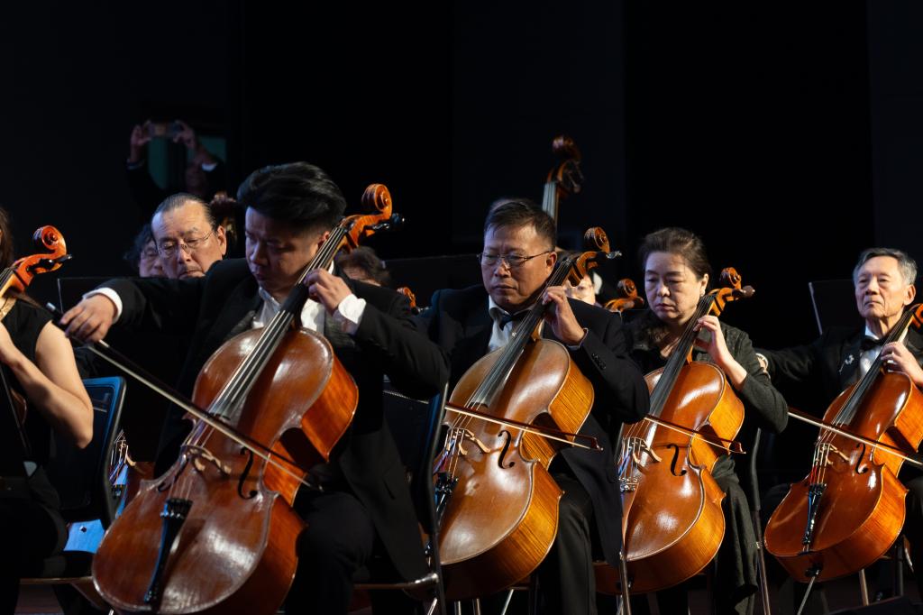 音乐会以恢弘的交响乐语言,演绎多首讴歌时代、赞美祖国的经典曲目,用音符串联起一代代人的家国情怀与奋斗记忆。慷慨激昂、脍炙人口的《红旗颂》表达了对英雄先辈的深切缅怀与崇高敬意。《红色娘子军》、《花儿为什么这样红》等红色经典曲目,引领师生重温峥嵘岁月,激扬爱国情怀;《明月三章》、《新春乐》等中国传统乐曲,则传递出细腻祥和的意境,抒发了对美好生活的珍视;《第二圆舞曲》、《天鹅》以及德沃夏克《第九交响曲“自新世界”》第四乐章等国外经典作品,展现了多元的音乐风情与人类对美好未来的共同向往。音乐会在返场曲目《歌唱祖国》的全场大合唱中达到高潮,激昂的歌声凝聚了师生对祖国的热爱与为民族复兴贡献力量的坚定信念。