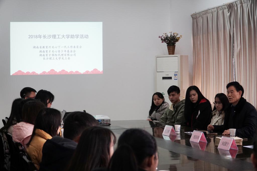 1月9日下午,2018年“湖南省教育厅关心下一代工作委员会、湖南育才关心青少年基金会、湖南育才保险代理有限公司”联合捐资助学活动于二办B404顺利举行。校关工委常务副主任王乃厚,育才保险代理有限公司驻我校代表殷东林、学生资助管理办公室主任宋国宁参加。活动由宋国宁主持。